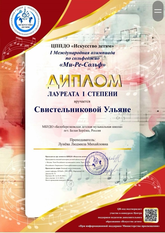 ПОЗДРАВЛЯЕМ СВИСТЕЛЬНИКОВУ УЛЬЯНУ, которая стала ЛАУРЕАТОМ l степени в I Международной олимпиаде по сольфеджио «Ми — Ре — Сольф».
